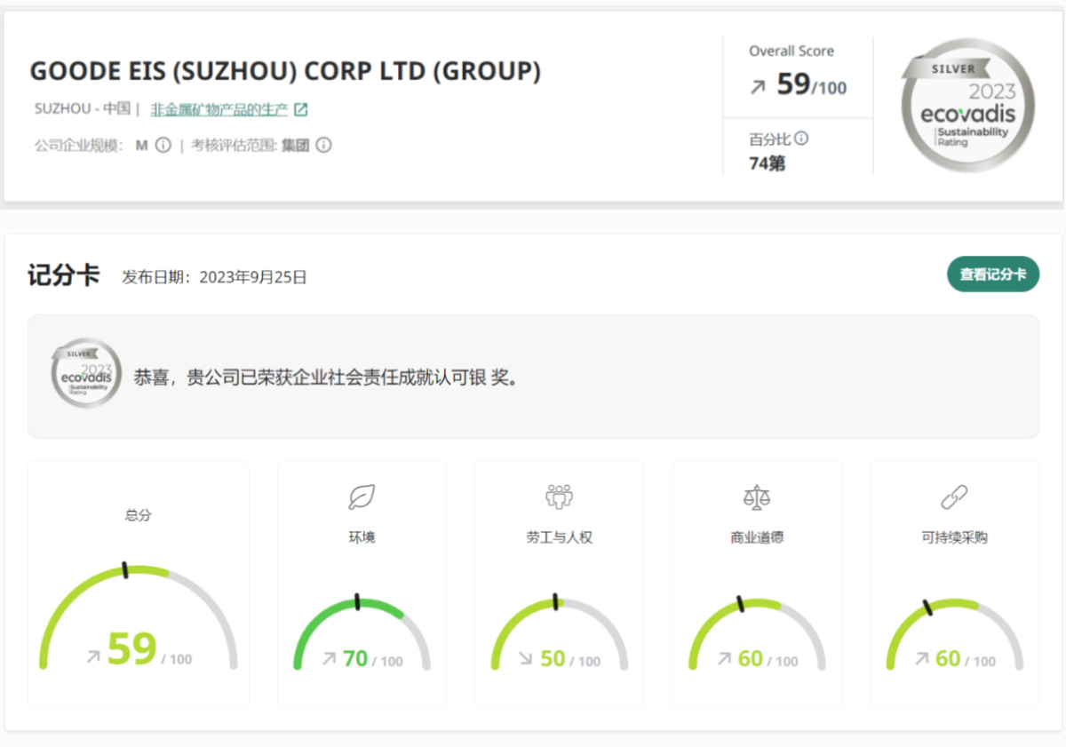 Nedavno je Goode EIS (Suzhou) Corp LTD. (Goode Electrical Materials) postigla je 59 bodova u ocjeni certifikacije održivosti Ecovadis 2023. i osvojila srebrnu medalju, rangirajući 26% od 85 000 poduzeća koja sudjeluju u globalnoj procjeni i 8% najboljih u Kini.